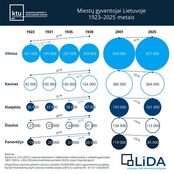 Per šimtmetį Lietuvos miestų demografinis žemėlapis gerokai pasikeitė. KTU Lietuvos humanitarinių ir socialinių mokslų duomenų archyvo (LiDA) infografikas „Miestų gyventojai Lietuvoje 1923–2025 metais“ atskleidžia ilgalaikes gyventojų skaičiaus tendencijas penkiuose didžiausiuose šalies miestuose – Vilniuje, Kaune, Klaipėdoje, Šiauliuose ir Panevėžyje.