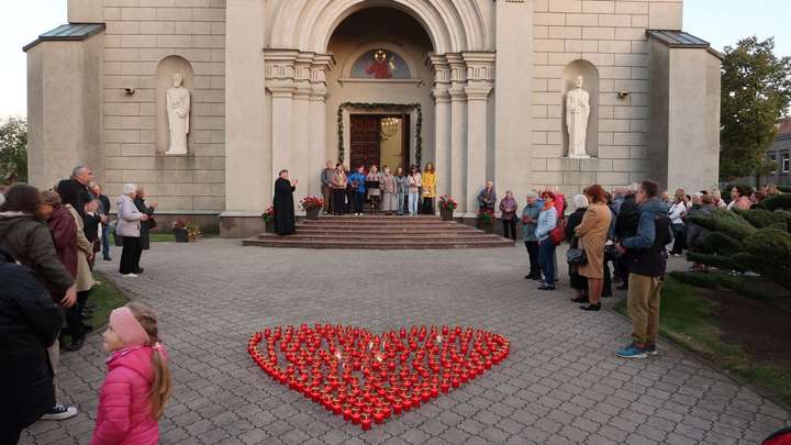 Po šv. Mišių priešais Katedrą raudonuose dėkluose uždegtos žvakelės supulsavo kaip didžiulė širdis, skleidžianti meilę, bendrystę, atjautą artimui.