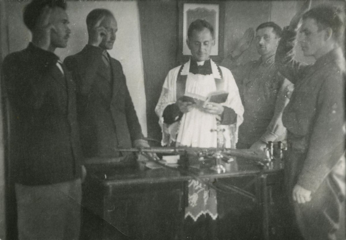 „Prieš altorių buvo pastatyta taburetė, užtiesta trispalve. Ant jos padėtas kryželis ir mano trumpasis ginklas. Kunigas pusbalsiu, bet aiškiai ir įspūdingai skaitė priesaikos tekstą. Mes, iškėlę dešines, tyliai kartojome priesaikos žodžius. Dievo akivaizdoje tvirtai pasižadėjome teisingai ir ryžtingai tęsti pradėtą kovą prieš okupantą, kuris, pamynęs po kojomis visus Dievo ir žmogaus įstatymus, negailestingai naikina visa, kas yra šventa, kilnu ir brangu. Aš priėjau pirmas. Pabučiavau kryželį, trispalvę ir ginklą. Tą pat padarė visi vyrai. Po to kunigas dar pasakė keletą prasmingų žodžių, tuo ir baigėsi šis iškilmingas aktas. Padėkojom dvasininkams, ir netrukus vėl atsidūrėm Noškūnų miško prieglobstyje...“