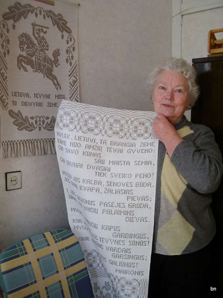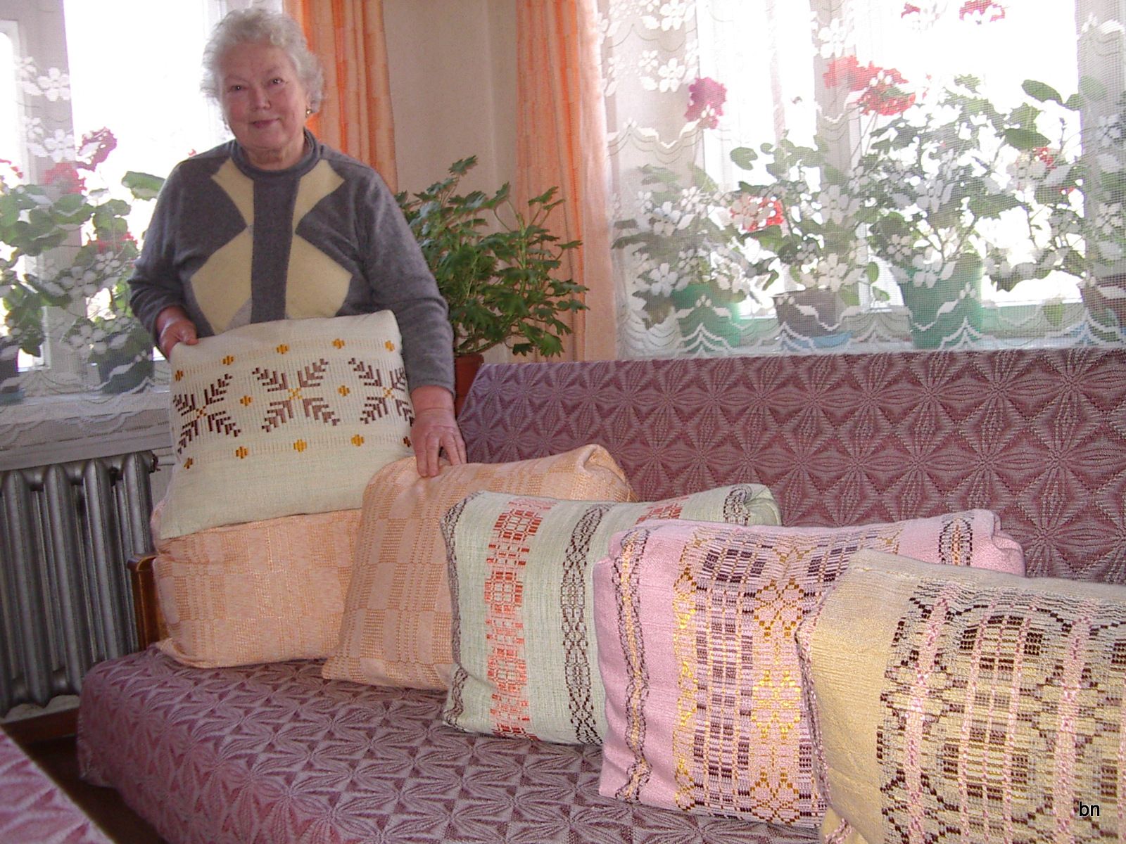 kienėi parodžiau nuotrauką, kurioje vienos viešnagės metu prieš dvidešimt metų nufotografavau ją prie rankšluosčių ir jos austų bei namus puošiančių pagalvėlių, besijuokdama tarė: „O, Dieve, kaip pasikeičiau!“ Ir pridūrė, kad daug tų nuaustų pagalvėlių užvalkaliukų padovanojo toms, kam patiko, o tą rankšluostį paėmė rengiamai parodai…