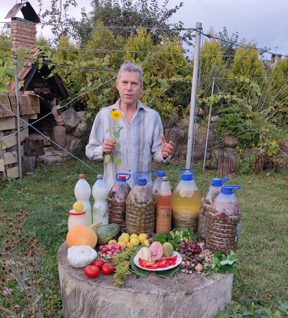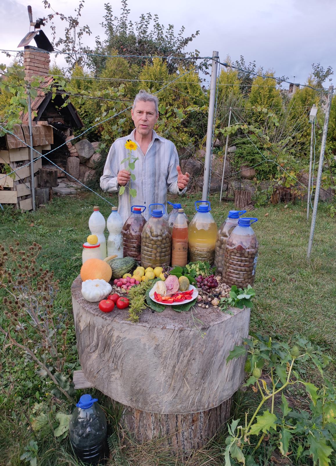 Jis pasisodina daržovių ir į žemės pripiltus polietileno maišus, kuriuos sustato darže. Juose auga svyrančios braškės, stiepiasi šparaginės pupelės, pomidorai ir violetiniais, mėlynais, raudonais žiedais žydinčios bulvės.